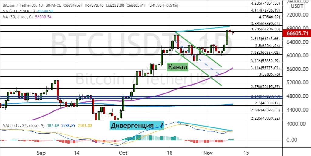 На графике биткоина сформировался медвежий сигнал в виде свечи «Додзи» и формирующейся дивергенции между ценой на графике биткоина и на осцилляторе MACD. Это может привести к снижению стоимости актива до уровня поддержки $64 350. Более глубокая коррекция направит котировки BTC к уровням $62 300, $60 300 и $57 850, где также проходят линия 50-дневной простой скользящей средней (SMA) и границы модели теханализа «Канал» (показана на графике ниже зеленым цветом).