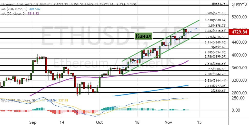 Эфир вслед за биткоином обновил исторический максимум, поднявшись до уровня сопротивления $4 880, где проходит верхняя граница модели теханализа «Канал» (показана на графике ниже салатовым цветом). Быкам сейчас важно закрепиться выше уровня $4 880, что откроет путь для продолжения роста к целям $5 040 и $5 270.
