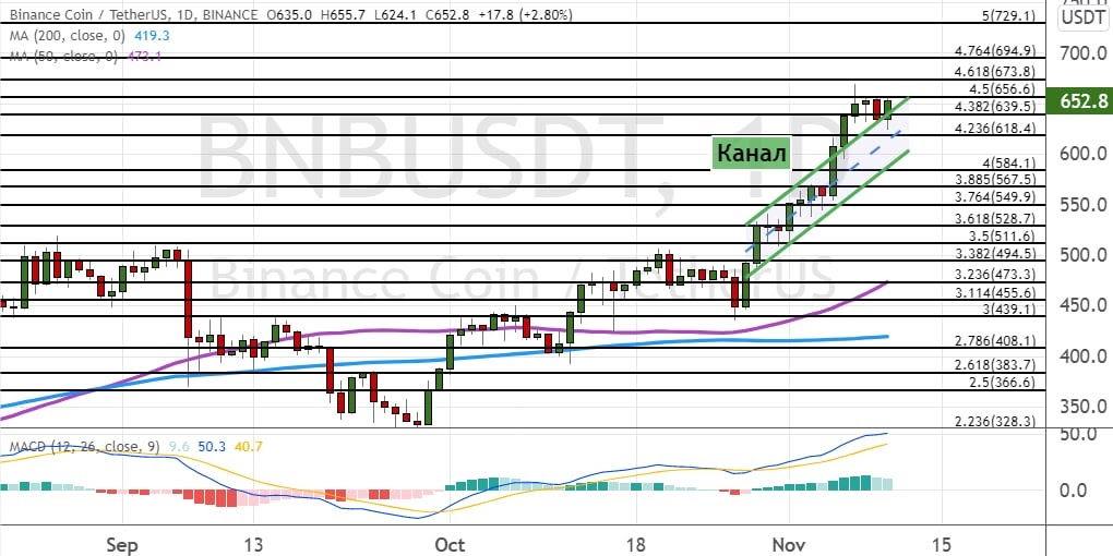 Текущей поддержкой для котировок BNB выступает уровень $642, где проходит верхняя граница модели теханализа «Канал» (показана на графике ниже зеленым цветом). Если BNB опустится ниже $642, это позволит медведям протестировать линии поддержки $620 и $600. Сохранение нисходящего импульса может привести к ретесту уровней $580 и $570.