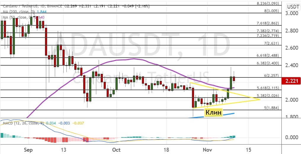 Котировки ADA успешно преодолели границу модели теханализа «Клин» (показана на графике ниже желтым цветом) и поднялись выше линии сопротивления на уровне $2. Текущие торги проходят в рамках консолидации уровней $2.11 и $2.25. Если быкам удастся закрепиться выше $2.25, это позволит цене ADA продолжить рост к уровням $2.4 и $2.5.