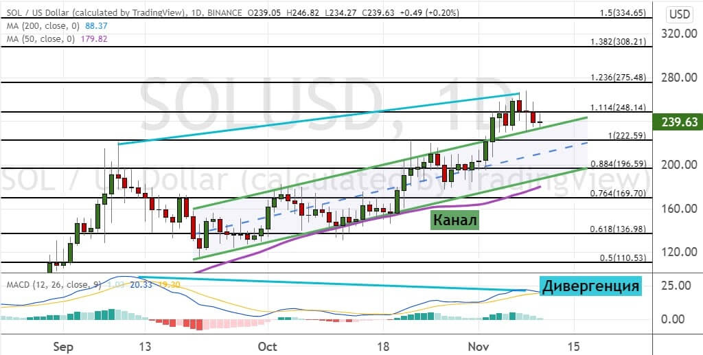 Однако падение котировок SOL ниже уровня поддержки $223 станет сигналом о развитии коррекции. На это указывает дивергенция между ценой на графике SOL и на осцилляторе MACD. Целями для медведей выступают уровни $200 и $170, где расположилась линия 50-дневной SMA.
