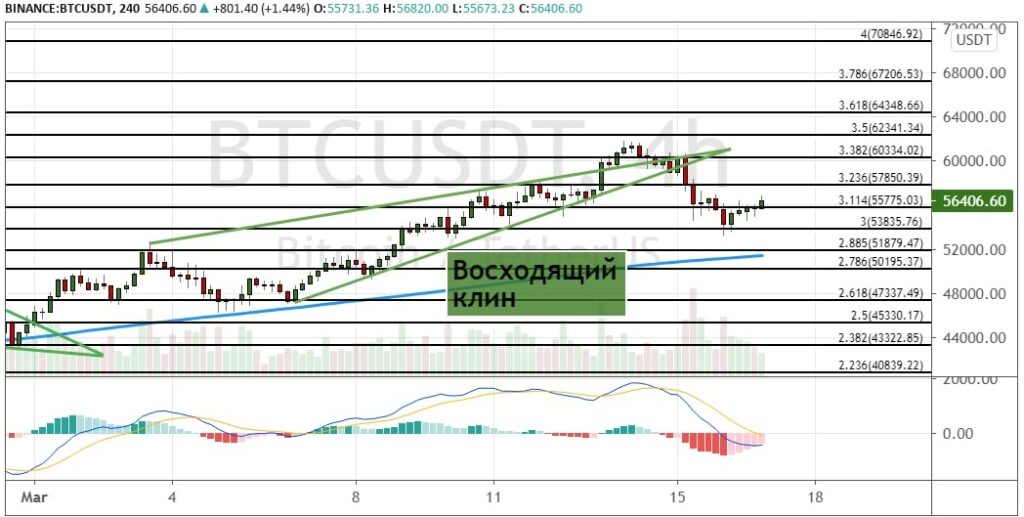 Биткоин реализовал прогноз о снижении, в результате чего котировки BTC от нового максимума в районе $61 700 обвалились к текущими поддержкам на уровнях $53 800 и $55 800.