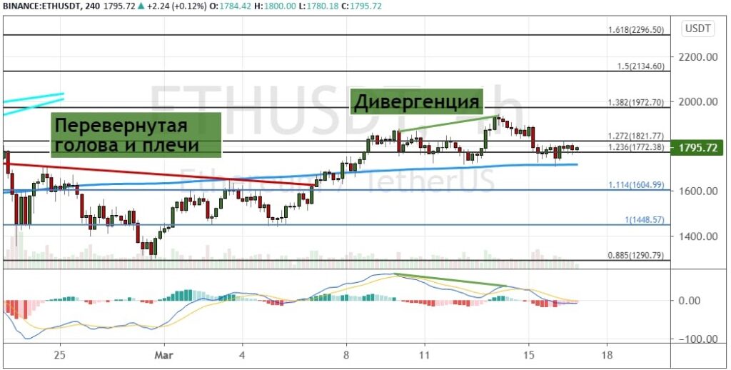 Новый конфликт между разработчиками Ethereum и майнерами сети сдерживает рост котировок второй по капитализации криптовалюты. В дополнение к этому реализовалась медвежья дивергенция между ценой на графике и осцилляторе MACD.
