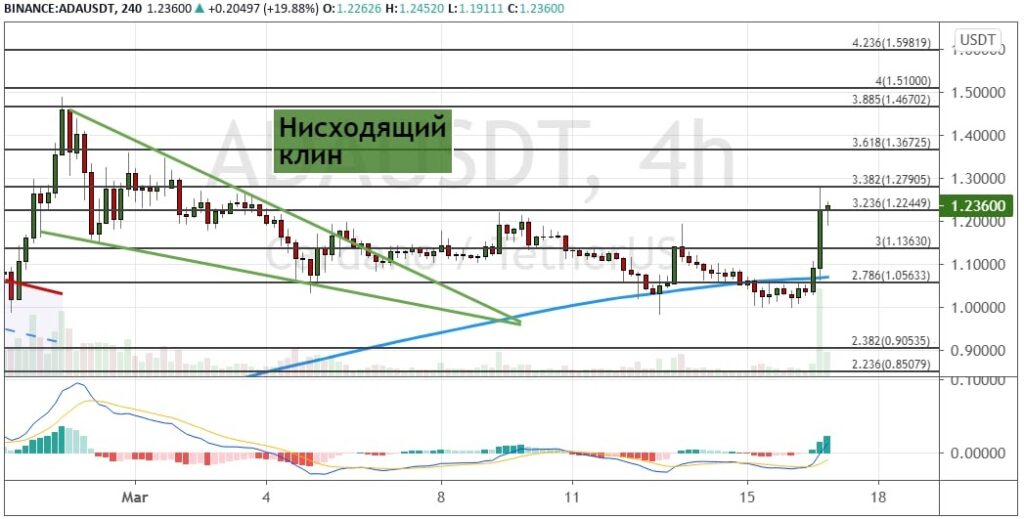 На этой неделе ADA показала уверенный рост, в то время как другие криптовалюты были склонны «торговаться в боковике». Так, альткоин поднялся выше линии 200-дневной SMA и достиг целей на уровнях $1.2250 и $1.2501. Сохранение восходящего импульса выглядит перспективнее, чем падение, что позволит ADA в среднесрочной перспективе устремиться к уровням $1.3680, $1.4670, $1.51, $1.60 и границам области $1.70 – $1.74.