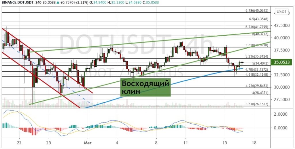 В последние дни DOT, в отличие от ADA и BNB, показывает коррекционное снижение, что привело к реализации медвежьего сценария. Так, котировки альткоина опустились ниже границ модели теханализа «Восходящий клин», отмеченной на графике ниже зеленым цветом. В результате DOT последовательно протестировал уровни $34.40, $33.20 и $32, где находится линия 200-дневной SMA.