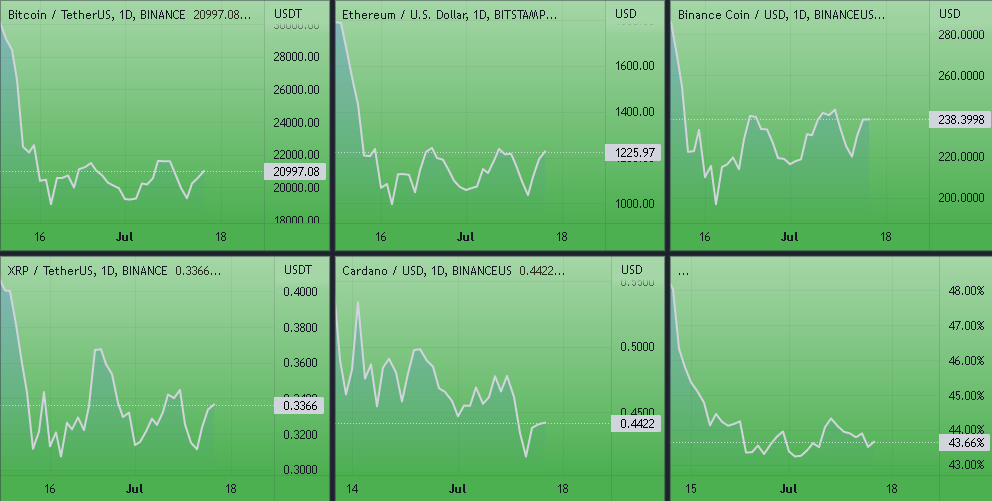 Динамика котировок BTC, ETH, BNB, SOL, XRP (дневной таймфрейм) и график доминации биткоина. Источник