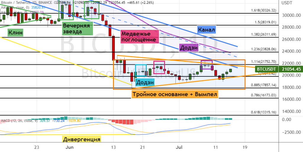 Текущей поддержкой для котировок первой криптовалюты выступает уровень $20 000. Закрытие дневных свечей ниже него послужит сигналом о восстановлении медвежьей динамики. Первой целью выступают уровни $19 000 и $17 800. Более глубокая коррекция приведет к достижению уровней $16 200 и $15 000. В пользу реализации этого прогноза все еще указывают семь перечисленных сигналов: модели теханализа «Медвежье поглощение», «Додзи» (обозначены линиями фиолетового и бирюзового цвета) и «Клин», а также пробитие нижних границ «Восходящего канала», «Флага» (линии оранжевого цвета) и две свечные комбинации «Вечерняя звезда».