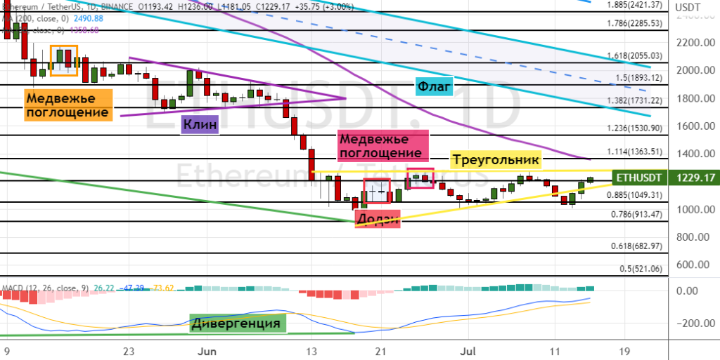 Уход котировок ниже $1 100 приведет к развитию снижения. В рамках нисходящего тренда стоимость эфира опустится до первых целей $1 100 и $1 000. Более глубокая коррекция приведет к достижению уровней $920 и $800. В пользу реализации этого прогноза указывает ранее произошедшее закрытие дневных свечей ниже границ модели «Треугольник», а также сохраняющие актуальность сигналы теханализа, такие как модели «Додзи», «Голова и плечи», две модели «Медвежье поглощение» (границы обозначены оранжевым цветом) и пробитие нижних границ «Флага» и «Клина».