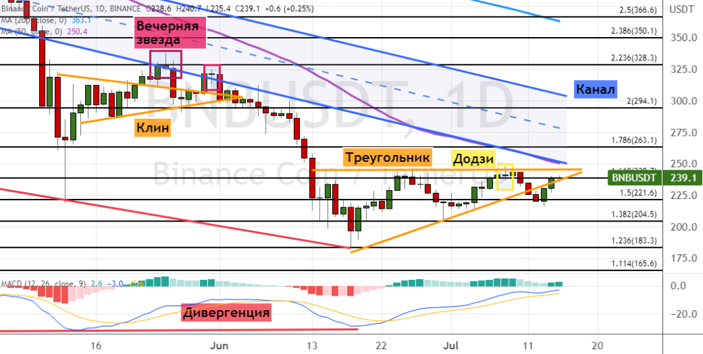 При этом уход котировок BNB ниже уровня поддержки $220 станет сигналом в пользу развития медвежьей динамики. Краткосрочное снижение может привести к достижению первых целей на уровнях $205, $200 и $180. Более глубокая коррекция приведет к обвалу стоимости BNB до целей $165 и $150. В пользу сохранения медвежьего тренда указывают восемь сигналов теханализа: ранее произошедшее преодоление границ «Треугольника», модели «Повешенный», «Додзи», «Медвежье поглощение» и две модели «Вечерняя звезда», а также пробитие границ «Флага» (обозначен синим цветом) и «Клина» (обозначен оранжевым цветом).