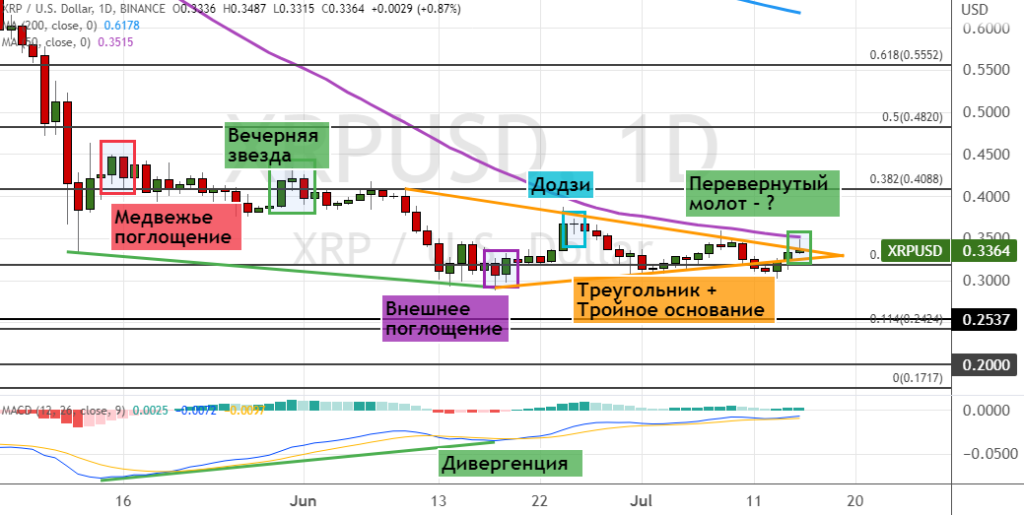 Сигналом о развитии бычьей динамики станет рост стоимости альткоина выше уровня $0.35, где также проходит линия 50-дневной SMA. Сохранение бычьей динамики приведет к достижению альткоином первых целей на уровнях $0.38 и $0.41. В случае сохранения краткосрочного тренда на повышение котировки XRP направятся к уровням $0.45, $0.48 и $0.55. В пользу развития восходящей динамики указывают пять сигналов: возможное преодоление верхней грани модели теханализа «Треугольник», модели «Тройное основание» и «Внешнее поглощение», а также бычья дивергенции между ценой на графике и осцилляторе MACD.