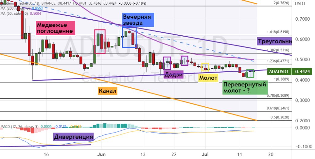 Если дневные свечи закроются ниже уровня $0.4, это станет сигналом о развитии краткосрочной медвежьей динамики. Первыми целями для котировок ADA выступят поддержки на уровнях $0.35 и $0.31. В пользу такого развития указывают шесть сигналов: преодоление нижней границы модели теханализа «Треугольник» (обозначена фиолетовым цветом), две модели теханализа «Додзи», а также модели «Перевернутый молот» (обозначены зеленым цветом), «Медвежье поглощение» (обозначена красным цветом) и «Вечерняя звезда» (обозначена синим цветом).