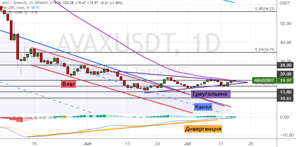 На рынке DeFi на втором месте после стейблкоина DAI держится AVAX от Avalanche. Котировки альткоина после повышения от поддержки $17 консолидируются в районе $20 и вдоль верхней границы модели «Треугольник» (на графике ниже обозначена фиолетовыми линиями).