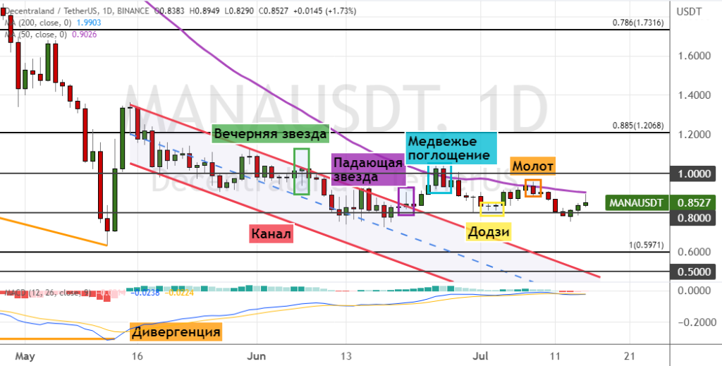 В случае закрытия дневных свечей выше уровня $0.9, где проходит линия 50-дневной SMA, начнется восстановление бычьей динамики, а ее сохранение приведет к движению котировок MANA до первой цели — уровня $1. Сохранение тренда приведет к достижению границ консолидации $1.2–$1.5. В пользу развития этой динамики указывают три сигнала: модель «Додзи», преодоление верхней границы «Канала» и бычья дивергенция между ценой на графике и осцилляторе MACD.