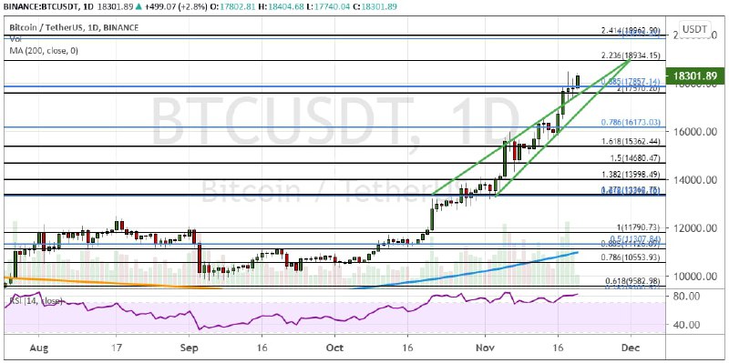 Следующими целями выступают кластер $18 930 – $19 000 (23.6% расширение по уровням Фибоначчи) и уровень $20 000. Последний является среднесрочной целью, но перед тем как преодолеть ее, биткоин может отправиться в краткосрочное коррекционное снижение.