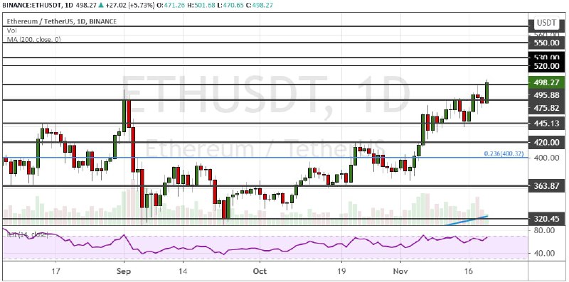 Котировки эфира ожидаемо преодолели сопротивления на отметках $450 и $475. Теперь краткосрочной целью выступает район сопротивления на $500. Если котировки ETH закрепятся выше сопротивления, то актив сможет протестировать район кластера $520 – $530.