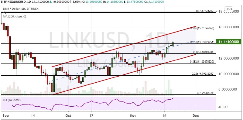 Котировки линк двигаются в рамках границ модели теханализа «Параллельный канал». После уверенного пробития сопротивления $12.58 (50% коррекция по линиям Фибоначчи) актив смог достичь краткосрочной цели $13.84 (61.8% коррекция по линиям Фибоначчи). Попытка закрепления выше этой отметки может привести к ретесту уровня $15 и подъему в район кластера $15.61 – $16. В среднесрочной перспективе стоит ожидать роста до $17.87.