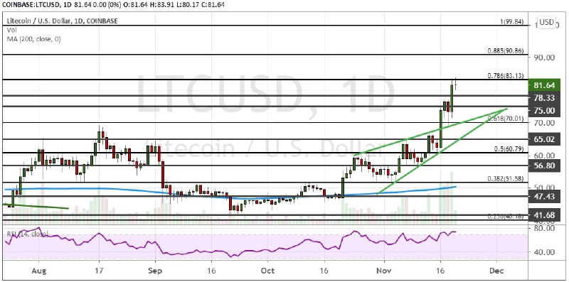 Лайткоин уверенно преодолел важное сопротивление на уровне $75, которое теперь выступает поддержкой. Рост капитализации рынка привел к достижению первых целей в виде кластера $78.30 – $80 и локального экстремума $83.20 (78.6% коррекционный уровень по линиям пропорции Фибоначчи). Среднесрочная цель находится на уровне $90.86, а чуть выше нее — еще один важный уровень $100 (88.5% и 100% уровень по линиям Фибоначчи).