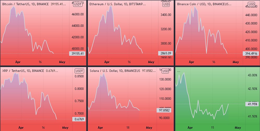 Динамика котировок BTC, ETH, BNB, SOL, XRP (дневной таймфрейм) и график доминации биткоина. Источник