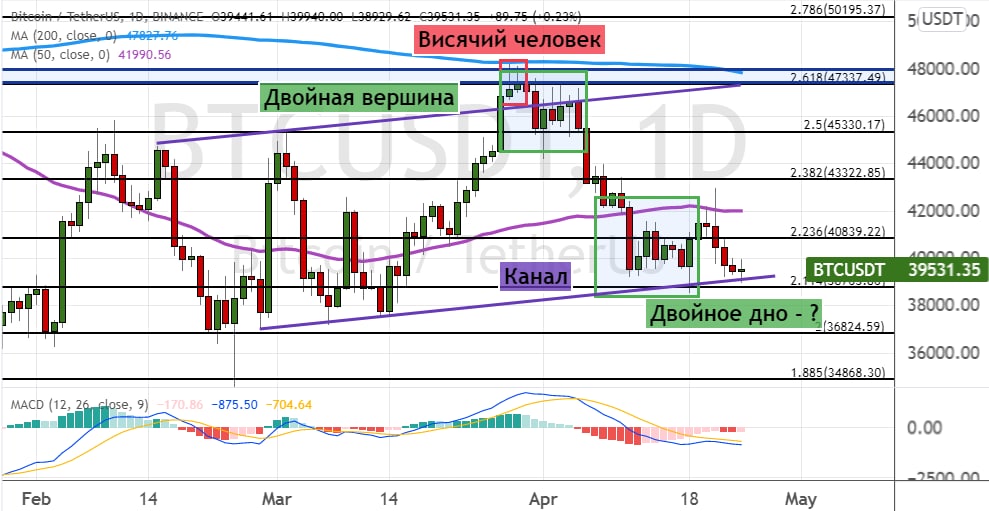 Если биткоин закрепится ниже уровня $38 800, это станет сигналом о развитии более глубокой коррекции. Целями в таком случае выступят уровни $36 800 и $34 800. В пользу реализации этого прогноза все еще указывают две модели теханализа — «Двойная вершина» (обозначена на графике ниже линиями зеленого цвета) и «Висячий человек».