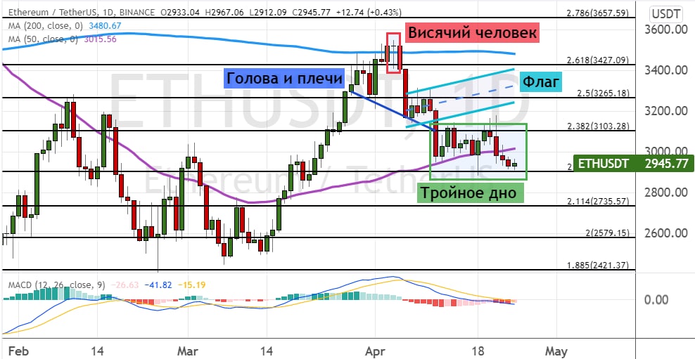 Эфир торгуется между поддержкой $2 900 и сопротивлением в виде района психологически важного уровня $3 000, где также проходит линия 50-дневной SMA. Сохранение медвежьей динамики приведет к движению котировок ETH к первым целям на уровнях $2 800 и $2 730. В пользу реализации этого прогноза указывают две модели теханализа — «Голова и плечи» (на графике ниже ее границы отмечены линиями синего цвета) и «Висячий человек». Более глубокая коррекция к $2 570 пока выглядит маловероятным сценарием развития торгов.