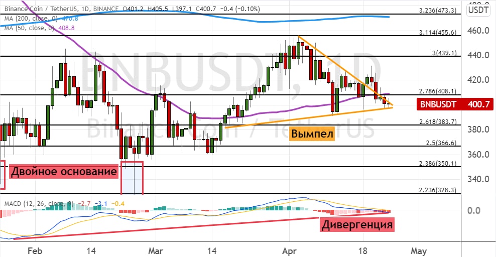 Но если дневные свечи смогут закрепиться выше верхней границы модели теханализа «Вымпел» (обозначена на графике ниже оранжевым цветом), это станет сигналом о продолжении восходящего движения котировок альткоина. В таком случае быкам важно будет закрепиться выше уровня $420, что позволит BNB направиться к границам консолидации $440–$455. Выше нее проходит линия 200-дневной SMA. Два сигнала — модель теханализа «Двойное дно» (обозначена на графике ниже красным цветом) и дивергенция между ценой на графике и MACD — указывают вероятную реализацию данного прогноза.