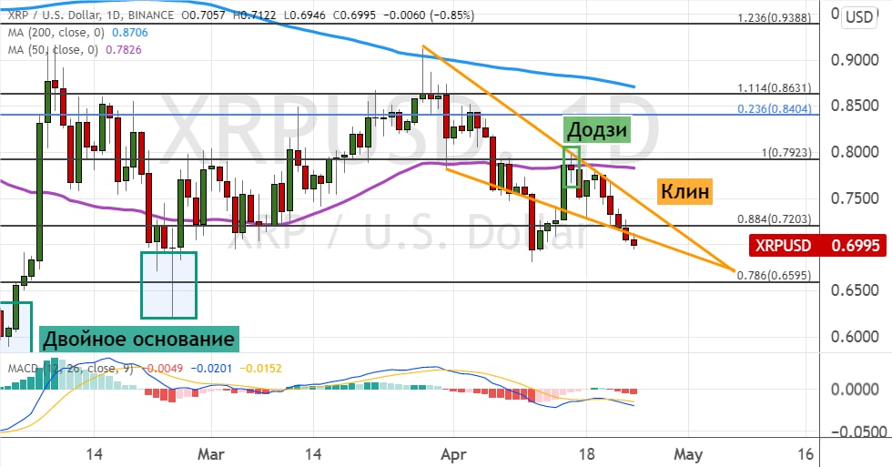 При этом если котировки XRP закрепятся выше уровней $0.72 и $0.75, это позволит альткоину направиться к уровню $0.8, где также проходит линия 50-дневной SMA. Сохранение восходящего импульса приведет к росту XRP до границ консолидации $0.84–$0.86, где также проходит линия 200-дневной SMA. В пользу реализации этого прогноза указывает сигнал в виде модели теханализа «Двойное основание» (на графике ниже обозначена бирюзовым цветом).