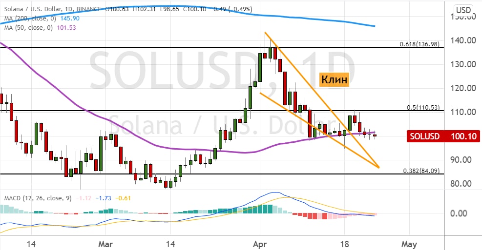 SOL торгуется чуть ниже важного уровня $100, где также проходит линия 50-дневной SMA. Закрытие дневных свечей ниже этого уровня приведет к движению котировок альткоина к целям $90 и $84. Здесь же проходят границы модели теханализа «Клин» (обозначена на графике ниже линиями оранжевого цвета).