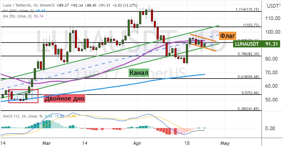 Лидер рынка DeFi криптовалюта LUNA опустилась ниже важного уровня поддержки $92. Также ее котировки консолидируются внутри границ сразу двух моделей теханализа «Канал» (обозначены на графике ниже линиями оранжевого и зеленого цвета).