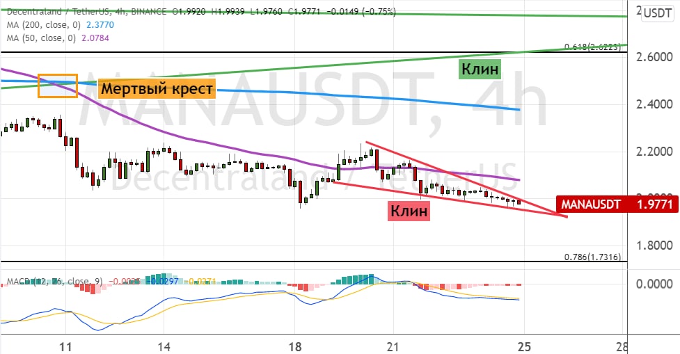 Второе место на рынках GameFi и NFT сохраняется за токеном MANA от виртуального мира Decentraland. Котировки альткоина опустились ниже уровня $2 и сейчас находятся внутри границ модели теханализа «Канал» (отмечена линиями бирюзового цвета). В этом районе также проходит линия 50-периодной SMA.
