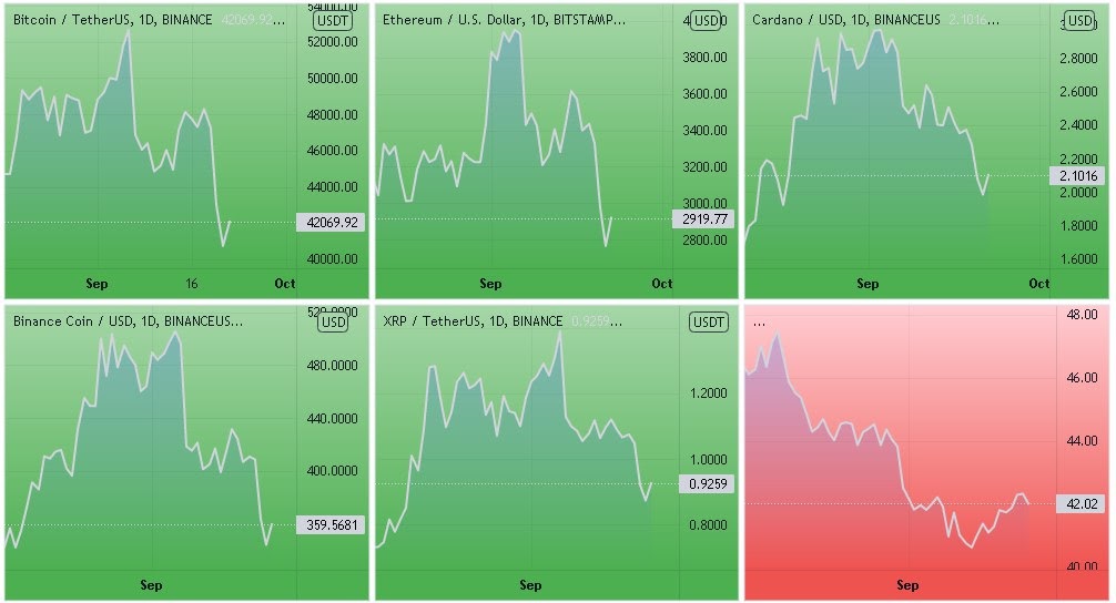 Динамика котировок BTC, ETH, ADA, BNB, XRP (дневной таймфрейм) и график доминации биткоина. Источник