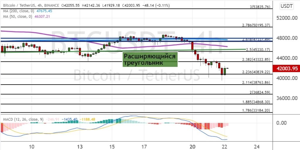 На графике ниже можно отметить, что котировки BTC продолжают находиться под давлением медведей. Пробитие поддержки на уровне $43 300 позволило котировкам BTC опуститься до текущей поддержки $40 800, от которой произошел отскок. И стоимость биткоина поднялась до уровня $42 500. Однако сохранение нисходящего импульса откроет путь для более глубокого снижения к $38 800, $36 800 и $34 900.