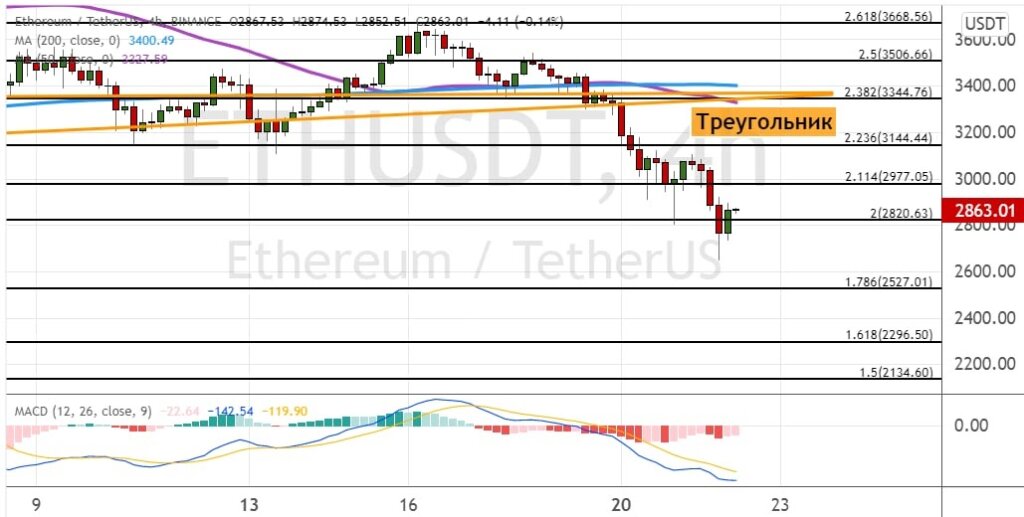На графике эфира сформировалась модель теханализа «Голова и плечи», которая показывает, что глобальное движение будет вниз. В результате котировки ETH опустились ниже поддержки на уровнях  $3 150 и $3 000. Это позволило эфиру опуститься до уровня $2 820, от которого, как и в случае с биткоином, произошел отскок до $2 950. Сохранение нисходящего импульса позволит эфиру устремиться к $2 650, $2 520 и $2 300.