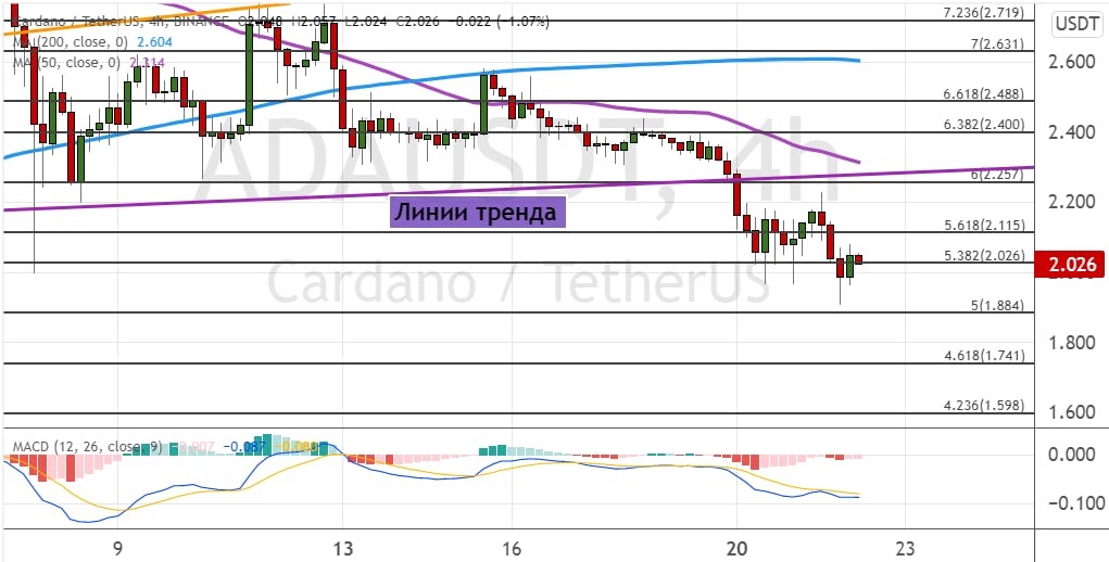 Котировки ADA после ретеста уровня $2.25, где проходит линия тренда (на графике ниже отмечена фиолетовым цветом) и линия 50-периодной SMA, устремились к поддержкам $2.10 и $2. Сейчас альткоину удалось частино восстановить позиции и подняться до уровня $2.13, но в случае возобновления нисходящего тренда ADA будет готов отправиться к следующим целям $1.9, $1.75 и $1.6.