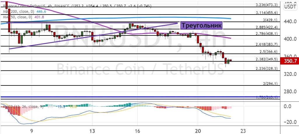 Котировки BNB вновь пытаются пробить важную линию поддержки на уровне $350. Если им это удастся, то первой целью для медведей выступит уровень $330. Более глубокая коррекция приведет к обвалу котировок BNB до $300 и $260.