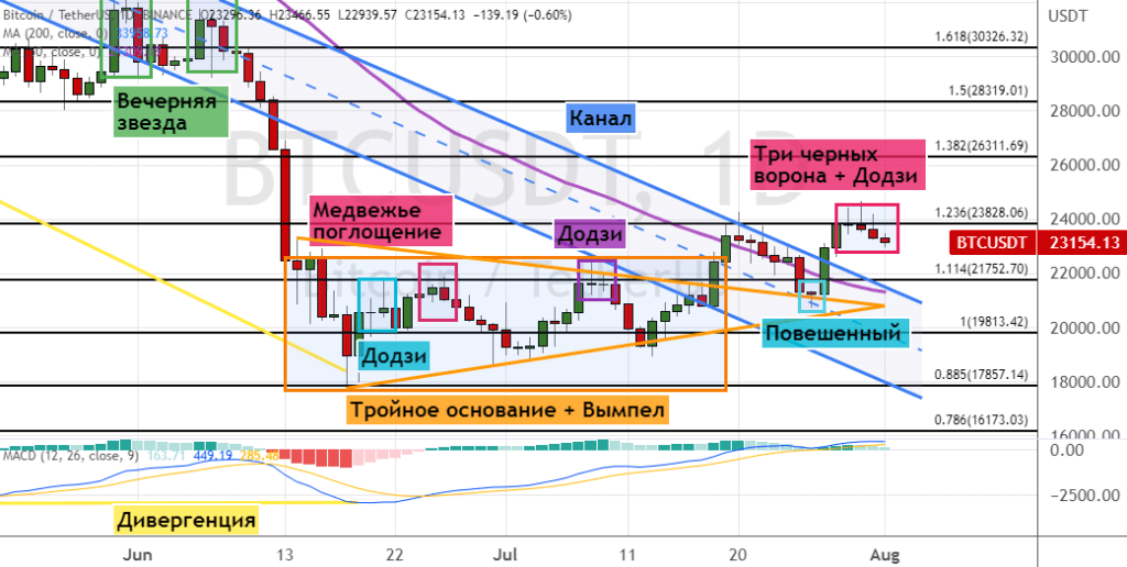 Если дневные свечи закроются ниже уровня текущей поддержки, это будет сигналом о развитии краткосрочной медвежьей динамики. Первыми целями для краткосрочного нисходящего тренда станет уровень $21 800, где проходит верхняя граница модели теханализа «Нисходящий канал» (обозначена синим цветом) и линия 50-дневной простой скользящей средней (SMA), а также уровни $20 000 и $19 800. Более глубокая коррекция направит котировки BTC к уровням $19 000 и $17 800. В пользу реализации этого прогноза все еще указывает возможное формирование моделей «Додзи» и «Три черных ворона» (обозначены розовым цветом) и такие сигналы, как модели теханализа «Медвежье поглощение», «Додзи» (линии фиолетового цвета), а также две свечные комбинации «Вечерняя звезда» и медвежья модель «Повешенный».