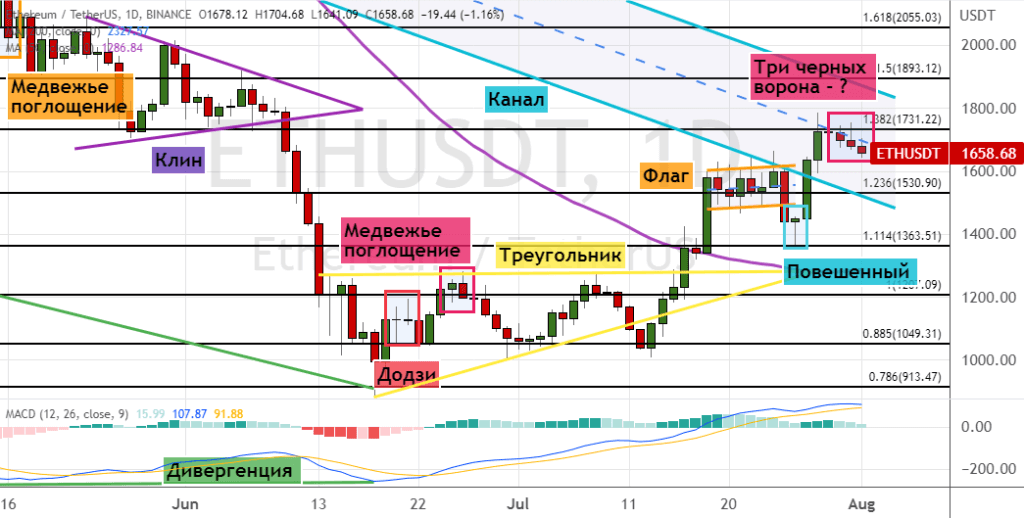 Текущими поддержками для котировок ETH выступают уровни $1 600 и $1 530, где проходит нижняя граница модели теханализа «Нисходящий канал» (обозначена бирюзовым цветом) и верхняя граница возможно формирующейся модели «Флаг». Если котировки опустятся ниже уровня $1 530, стоит ожидать падения эфира до уровней $1 363 и $1 300. В районе последнего также проходит линия 50-дневной SMA и верхняя граница «Треугольника». В рамках медвежьей динамики котировки альткоина устремятся к первым целям — $1 200, $1 100 и $1 050. В пользу реализации этого прогноза указывает возможное формирование модели «Три черных ворона» (обозначена розовым цветом), а также такие сигналы теханализа, как «Медвежье поглощение» (границы обозначены оранжевым цветом) и пробитие нижних границ «Клина».