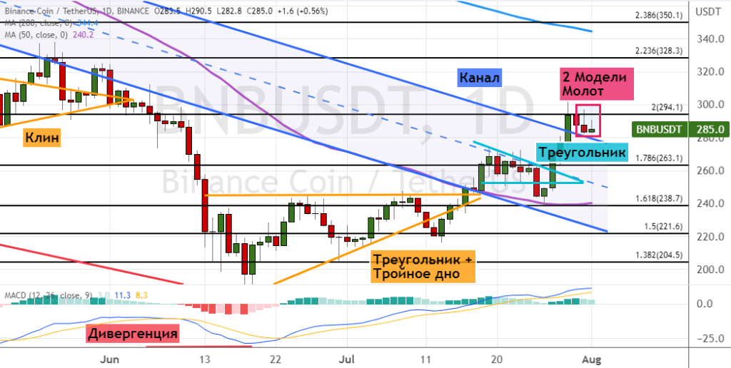 Закрытие дневных свечей выше $300 станет сигналом о развитии краткосрочной бычьей динамики. Первые цели для быков расположены в районе границ кластера $320–$330. Сохранение восходящей динамики приведет к росту стоимости альткоина до уровня $350, где также проходит линия 200-дневной SMA. В пользу реализации этого сценария торгов указывает возможное формирование двух моделей «Молот», а также три сигнала: пробитие границы «Нисходящего канала» (обозначена синим цветом) и моделей «Треугольник» , а также сохраняющая актуальность модель «Тройное дно» и дивергенция между ценой на графике и осцилляторе MACD.