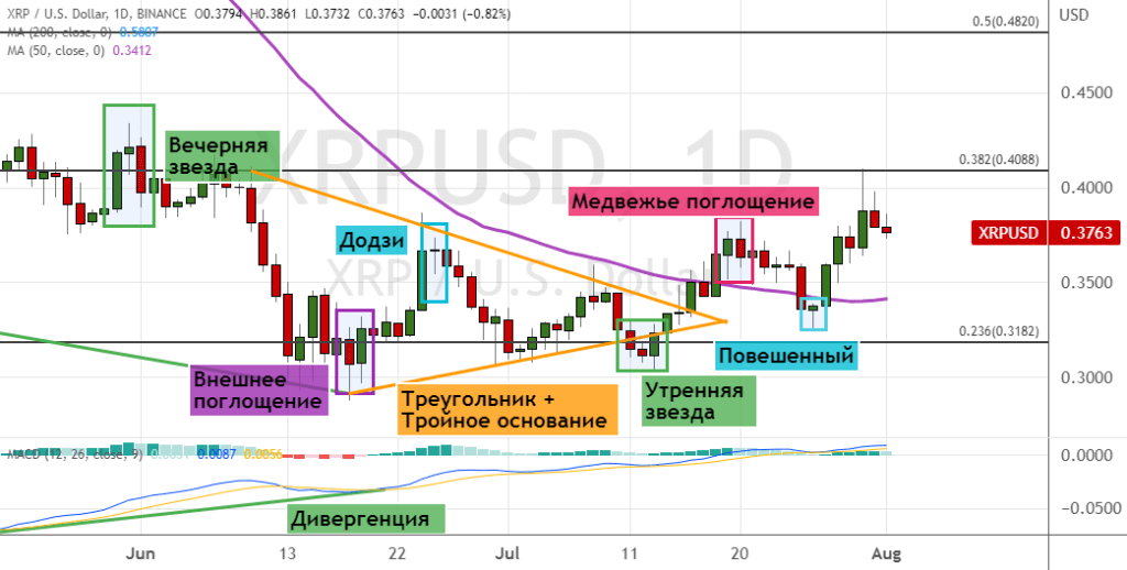 Сегодня котировки XRP опустились ниже уровня $0.38. Закрытие дневных свечей выше границ кластера $0.4–$0.41 станет сигналом о развитии новой волны краткосрочного бычьего тренда. Он приведет к росту альткоина до первых целей — $0.45, $0.48 и $0.55. В пользу развития восходящей динамики указывают шесть сигналов теханализа: преодоление верхней границы модели «Треугольник», а также формирование моделей «Повешенный» (границы отмечены бирюзовым цветом), «Тройное основание», «Утренняя звезда», «Внешнее поглощение» и бычья дивергенция между ценой на графике и осцилляторе MACD.