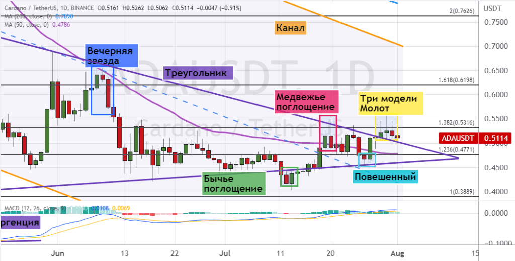 Первые цели быков расположены на уровнях $0.62 и $0.7. В районе последнего также проходит верхняя граница модели теханализа «Нисходящий канал». Сохранение тренда в рамках среднесрочного восходящего тренда позволит быкам направиться к цели $0.76, где также расположена линия 200-дневной SMA. Дальше котировки ADA будут готовы преодолеть верхнюю границу кластера $0.85–$0.9. В пользу реализации этого прогноза указывают сигналы в виде возможного преодоления верхней границы модели «Треугольник», модели «Бычье поглощение» и «Повешенный» (отмечена бирюзовым цветом на графике), а также бычья дивергенция между ценой на графике и осцилляторе MACD.