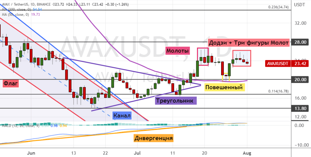 Закрытие дневных свечей выше этого уровня станет сигналом о восстановлении восходящей динамики. В таком случае краткосрочный бычий тренд позволит котировкам AVAX подняться до уровней $28, $34.80 и $40. В пользу развития этого сценария торгов указывает пять сигналов теханализа: модель теханализа «Повешенный» (отмечена желтым цветом), преодоление верхних границ моделей теханализа «Флаг», «Канал» и «Треугольник», а также бычья дивергенция между ценой на графике и осцилляторе MACD.