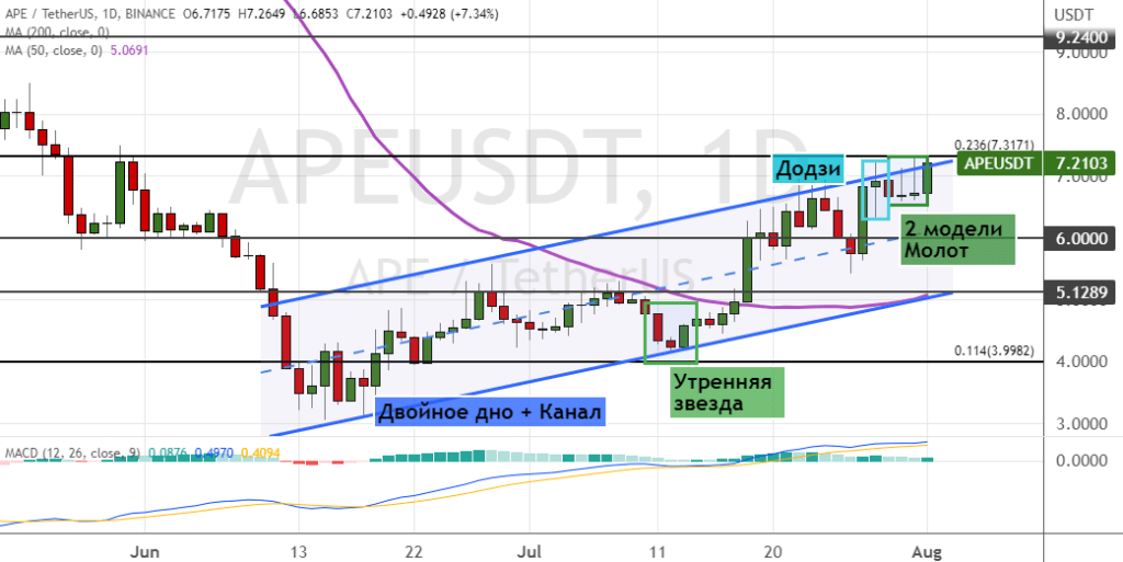 Закрытие дневных свечей выше уровня $7.3 станет сигналом о развитии краткосрочной восходящей динамики. В рамках бычьего тренда котировки токена устремятся к первым целям — $8 и $9.2. Если же APE сможет закрепиться выше $9.2, это станет сигналом о развитии среднесрочного восходящего тренда, который направит стоимость актива к уровням $10 и $11.3. В пользу реализации этого прогноза указывают три сигнала: модели «Двойное дно», «Утренняя звезда» и возможное преодоление верхней границы «Канала».