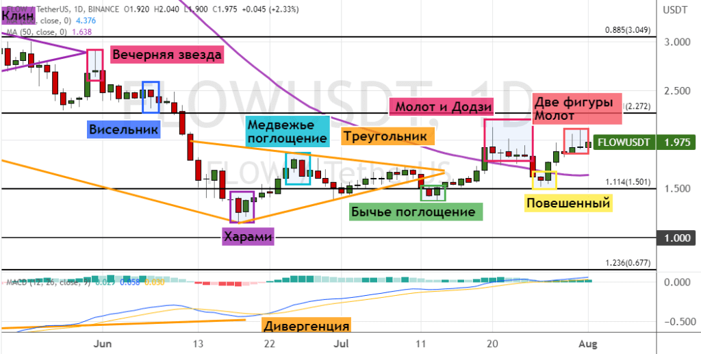 Если же котировки альткоина опустятся ниже уровня поддержки $1.7, где также проходит линия 50-дневной SMA, и уровня $1.5, то дальше медведи могут обвалить стоимость актива до нижней границы консолидации $1.2–$1.5. Более глубокая коррекция приведет к падению стоимости FLOW до кластера консолидации на уровнях $1–$0.7. В пользу развития краткосрочной нисходящей динамики указывают следующие сигналы: прорыв нижней границы модели теханализа «Треугольник», а также модели «Медвежье поглощение», «Вечерняя звезда» и возможно формирующиеся три модели «Молот» и модель «Додзи».