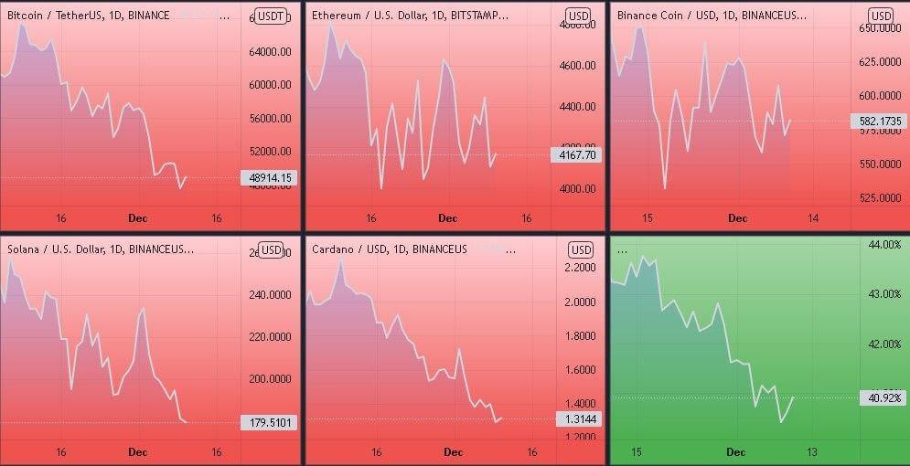 Динамика котировок BTC, ETH, ADA, BNB, XRP (дневной таймфрейм) и график доминации биткоина. Источник