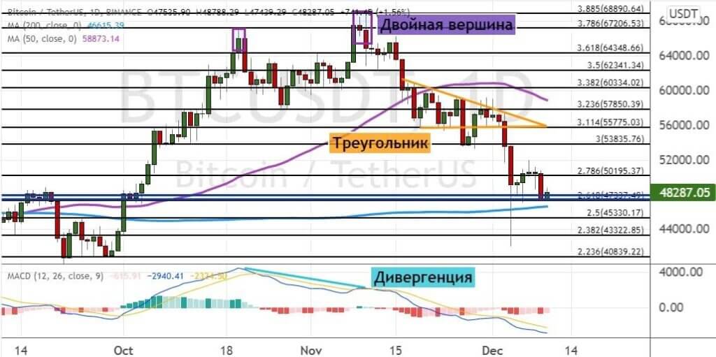 Котировки BTC продолжают снижаться. Это привело к повторному тестированию кластера уровней $47 300–$48 000, где также проходит линия 200-дневной простой скользящей средней (SMA).
