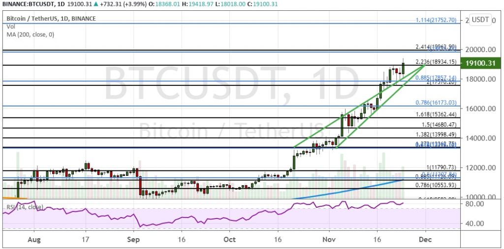 Крипторынок продолжает расти на фоне грядущего рождественского ралли, которое на классических рынках сопровождается притоком капитала. Но существует и ряд объективных факторов, способствующих такой динамике. Во-первых, крипторынок вслед за фондовым рынком США позитивно реагирует на новости о высокой стадии готовности вакцин от коронавируса. Во-вторых, Управление по надзору за финансовым сектором Южной Африки (FSCA) готово признать в качестве финансового продукта биткоин и альткоины. За этим решением последуют и другие шаги по регулированию крипто-отрасли в данном регионе. В то же время 23 ноября венчурная фирма Pantera Capital отчиталась о росте объема средств, направленного в биткоин-фонд компании. Так, первый биткоин-фонд в США привлек более $134 млн, а с момента запуска в 2013 году принес инвесторам доход в размере 15 000%. Но что говорят индикаторы теханализа о перспективах и топовых криптовалют, и как долго продолжится рост крипторынка?