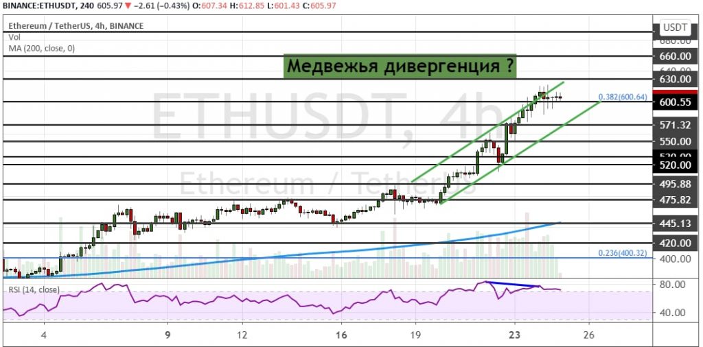 От нее котировки могут скорректироваться к $580 и даже $550. В пользу непродолжительной коррекции говорит формирование медвежьей дивергенции между ценой на графике и осцилляторе RSI. Но сохранение позитивной динамики может отправить стоимость альткоина вверх к $630, $660 и $700.