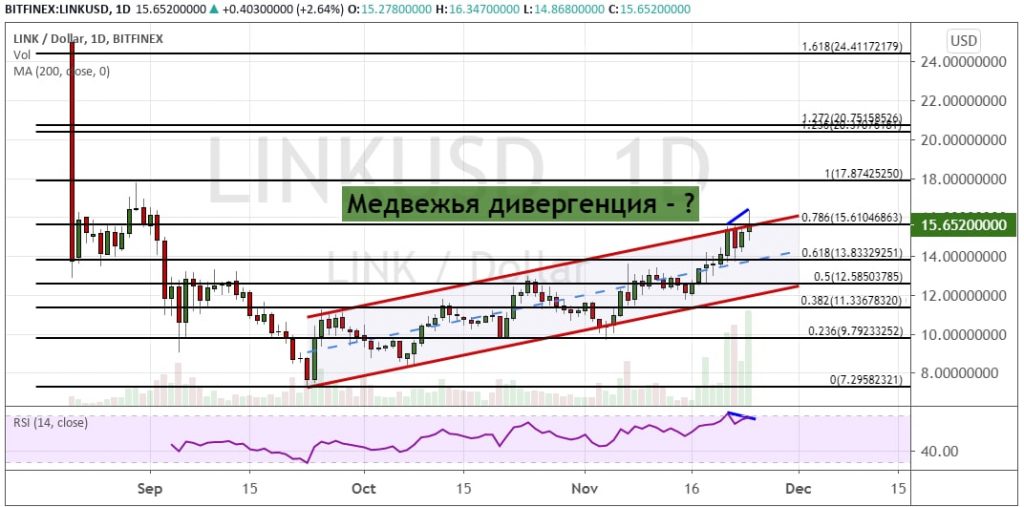 Но перед развитием мощного роста может произойти коррекция из-за появления сигнала в виде медвежьей дивергенции. Текущими поддержками выступают отметки $13.84 и $12.58 (61.8% и 50% коррекции по линиям Фибо).