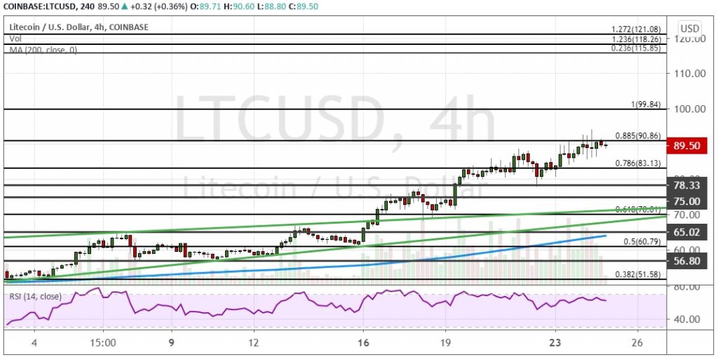 Но нужно отметить и сохранение «перекупленности» на осцилляторе RSI. В случае ухода ниже области поддержки $78.30 – $80 котировки LTC отправятся к $70 и далее к $65, где сейчас проходят грани модели теханализа «Восходящий клин». Сохранение тренда станет сигналом для обвала к $60 (50% коррекционный уровень по линиям пропорции Фибоначчи), где сейчас проходит линия 200-дневной SMA.