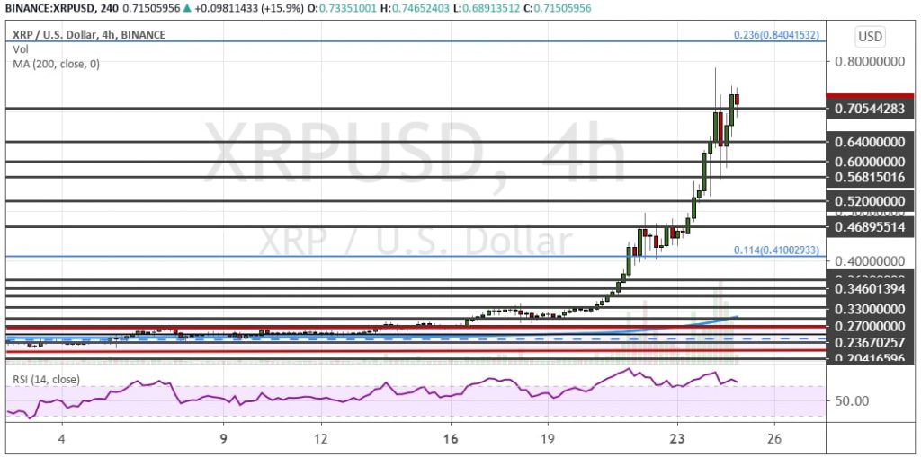 На этой неделе заметно выросло количество зарегистрированных адресов в сети XRP. Котировки альткоина уверенно достигли целей $0.50, $0.52, $0.5682 и $0.60. Сейчас наблюдается попытка закрепления выше $0.7054. Если активу это удастся, то это позволит котировкам устремиться далее к $0.80 и $0.84 (23.6% коррекция по линиям пропорции Фибоначчи).