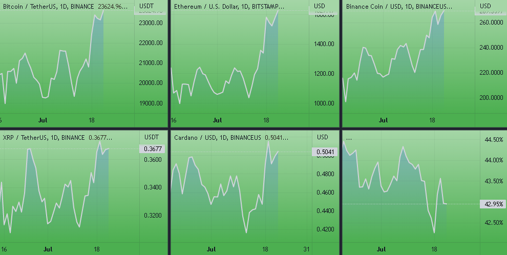 Динамика котировок BTC, ETH, BNB, SOL, XRP (дневной таймфрейм) и график доминации биткоина. Источник